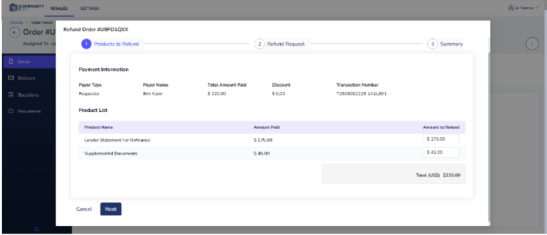 - Resales Admin users see the summary of the refund process and complete delivery information to ensure accuracy. Users can add new email addresses or remove current ones.