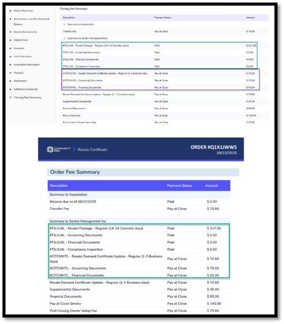 - When a user places an order for a Resale Demand Certificate Update or a Financial Update, the system automatically populates the Closing Fee Summary section with all relevant fees from all prior orders.