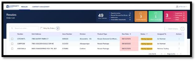 - In Resales Admin, orders that are past due or due to be completed today have were added to the KPI statics board as Pending Approval. This is only visible for Resales Admin users and not clients.