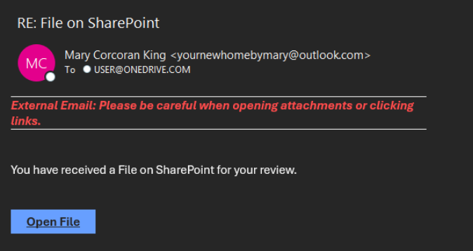 Tech Support has been made aware of an email coming from “Mary Corcoran King <yournewhomebymary@outlook.com>"