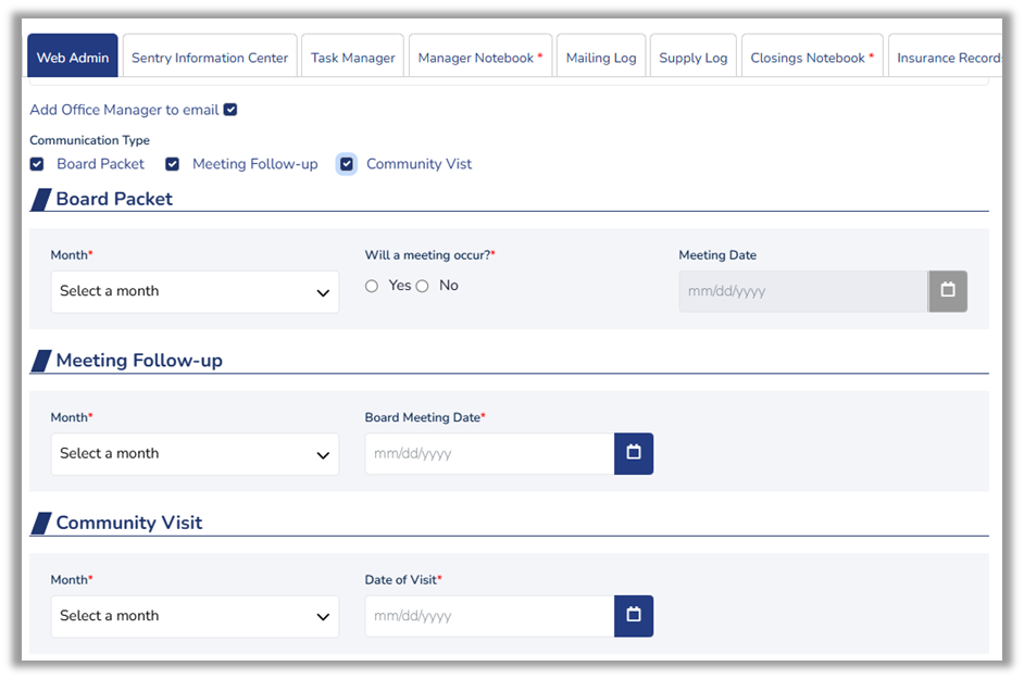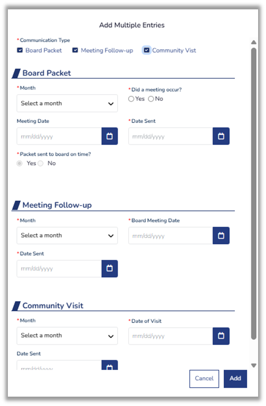 - Select multiple communication categories at once with a checkbox. Then, the system dynamically displays the data points required for each category selected. Shared information (such as month selection) is reused, but editable.