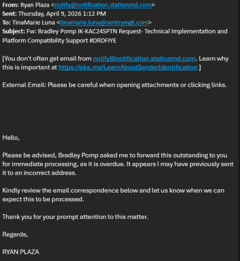 We are reviewing two suspicious emails - one from Keller Williams Realty, Inc <stephaniechapman@kw.com> and one from Ryan Plaza <notify@notification.stationmd.com>